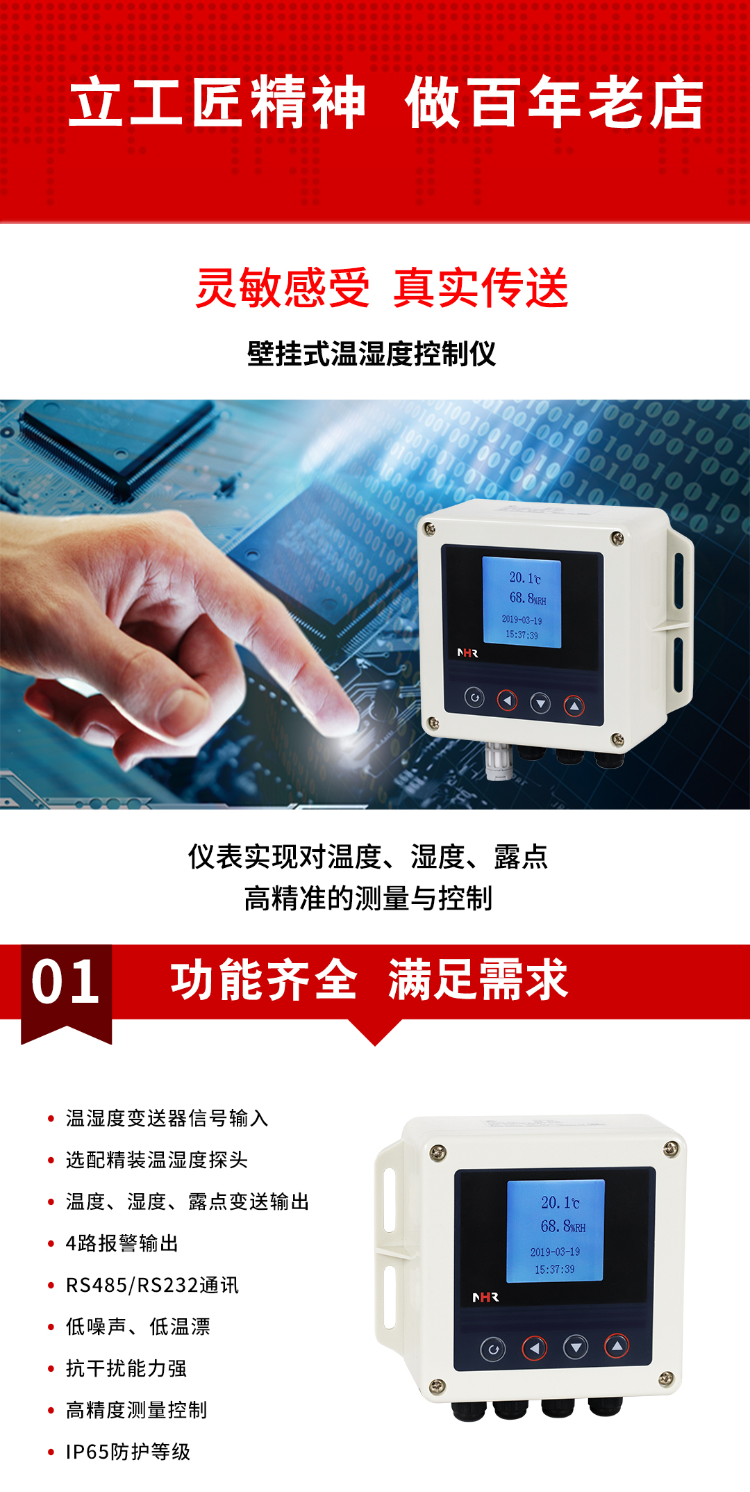 虹潤公司是專業(yè)生產(chǎn)環(huán)境監(jiān)測儀表的國家專精特新“小巨人”企業(yè)。生產(chǎn)的壁掛式溫濕度控制器,具有溫度、濕度、露點高精準的測量,多種輸出類型,穩(wěn)定性強,RS485/RS232通訊,IP65防護等級等特點。產(chǎn)品獲得一種手持式低功耗溫濕度檢測儀、大屏幕溫濕度記錄儀等2項國家發(fā)明專利,主持起草物聯(lián)網(wǎng)智能溫度儀表通用技術條件、冷鏈溫度記錄儀等2項國家標準,通信系統(tǒng)多通道數(shù)據(jù)采集控制終端規(guī)范軍用標準,以及現(xiàn)場設備集成等5項智能制造國家標準,參與國際5G標準制定,取得溫濕度儀表等2項相關軟件著作權(quán)。產(chǎn)品廣泛應用于工業(yè)現(xiàn)場、農(nóng)業(yè)大棚、倉儲物流、地下管廊、養(yǎng)殖孵化、配電機房等諸多領域。