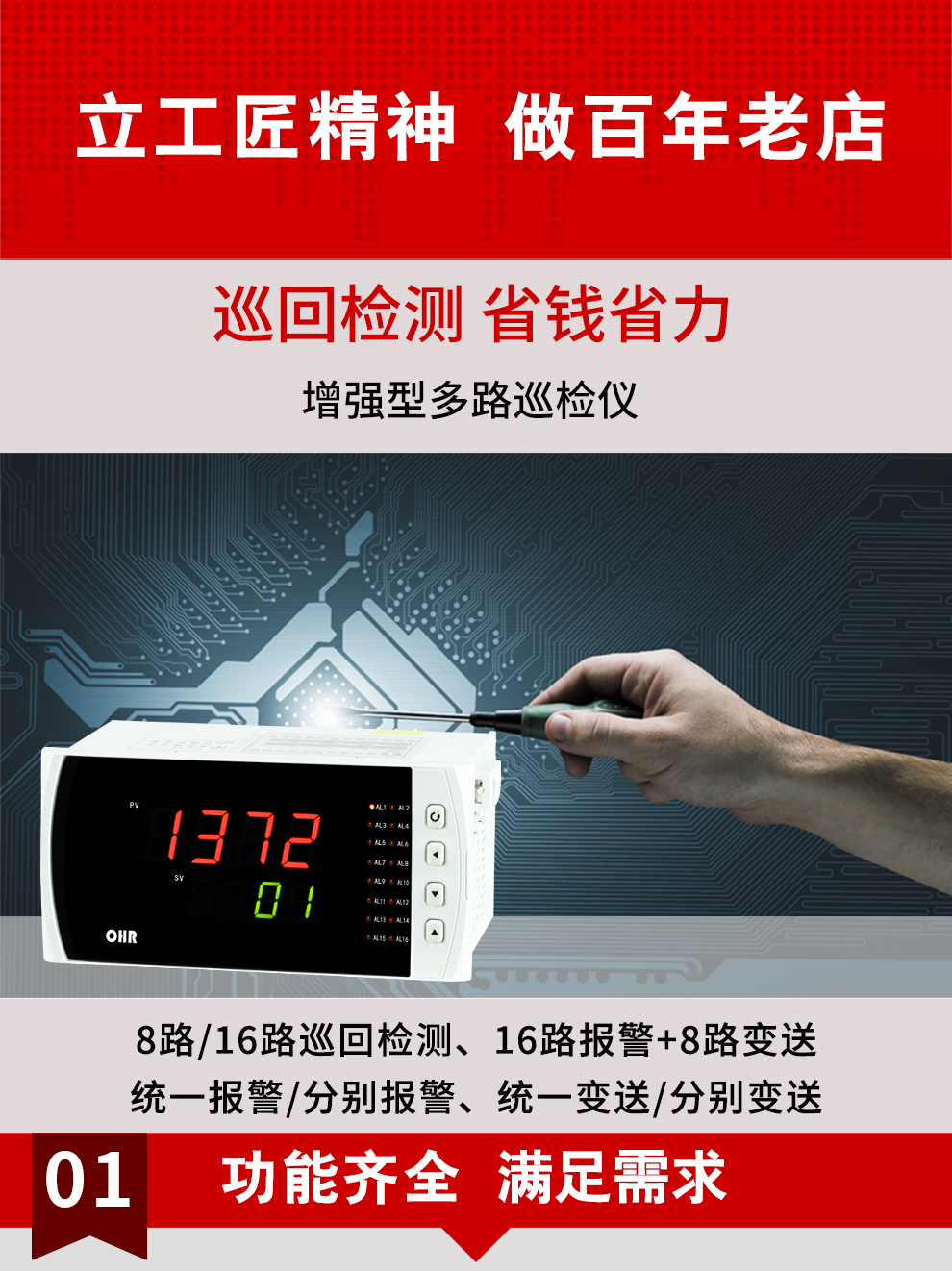 虹潤公司是專業(yè)生產多路溫度巡檢儀的國家專精特新“小巨人”企業(yè),生產的增強型多路巡檢儀,具有8路/16路測量通道,全切換信號輸入,多種輸出類型,高抗干擾,RS485/RS232通訊等特點。產品獲得巡回檢測顯示方法及裝置、儀表殼體等2項國家發(fā)明專利,主持起草工業(yè)過程控制系統(tǒng)用模擬輸入兩位或多位輸出儀表、物聯(lián)網智能溫度儀表通用技術條件等2項國家標準,以及通信系統(tǒng)多通道數據采集控制終端規(guī)范軍用標準,參與國際5G標準制定,取得多回路測量顯示控制儀等3項相關軟件著作權。產品廣泛應用于電力、石化、冶金、制藥、水處理、機械配套等各種工業(yè)現(xiàn)場。