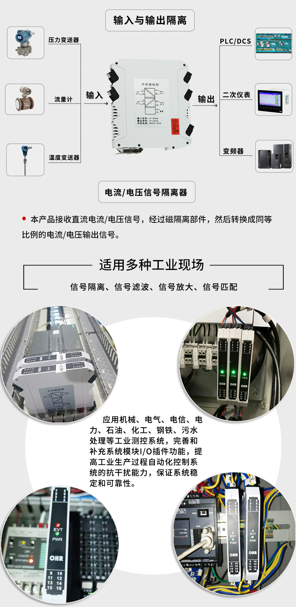 虹潤(rùn)公司是專(zhuān)業(yè)生產(chǎn)隔離器的國(guó)家專(zhuān)精特新“小巨人”企業(yè)。生產(chǎn)的信號(hào)隔離器,具有采用磁隔離技術(shù),直流電壓/電流輸入,響應(yīng)時(shí)間快,抗干擾能力強(qiáng),性?xún)r(jià)比高等特點(diǎn)。該產(chǎn)品不僅通過(guò)德國(guó)萊茵 CE 認(rèn)證與 SIL 功能安全認(rèn)證,還獲得信號(hào)隔離器、二端子模塊、無(wú)源信號(hào)隔離器等3項(xiàng)國(guó)家發(fā)明專(zhuān)利,主持起草現(xiàn)場(chǎng)設(shè)備工具(FDT)接口規(guī)范、工業(yè)過(guò)程測(cè)量和控制系統(tǒng)用隔離式安全柵、工業(yè)過(guò)程測(cè)量和控制系統(tǒng)用配電器等3項(xiàng)國(guó)家標(biāo)準(zhǔn),以及通信系統(tǒng)多通道數(shù)據(jù)采集控制終端規(guī)范軍用標(biāo)準(zhǔn),參與國(guó)際5G標(biāo)準(zhǔn)制定。產(chǎn)品廣泛應(yīng)用于石油、電力、化工,冶金、制藥、污水處理、窯爐控制等各種需要電隔離的工業(yè)現(xiàn)場(chǎng)。