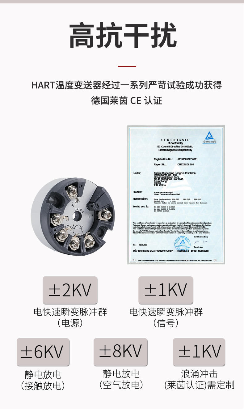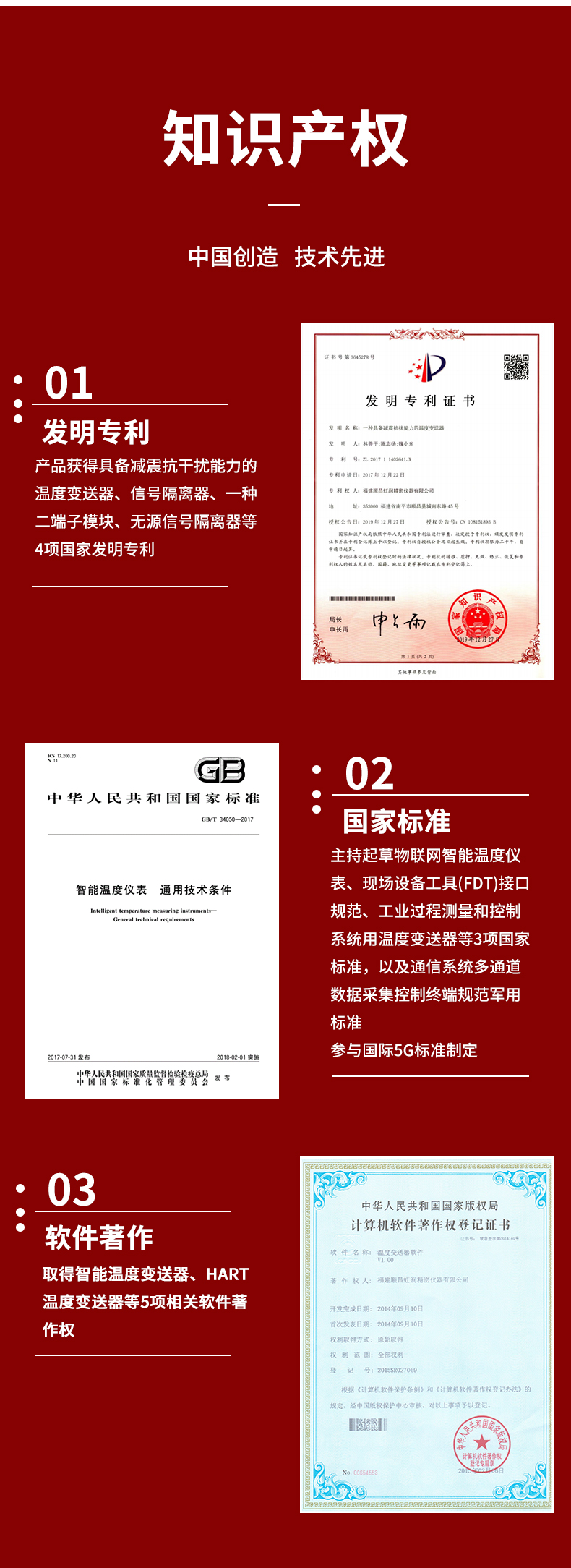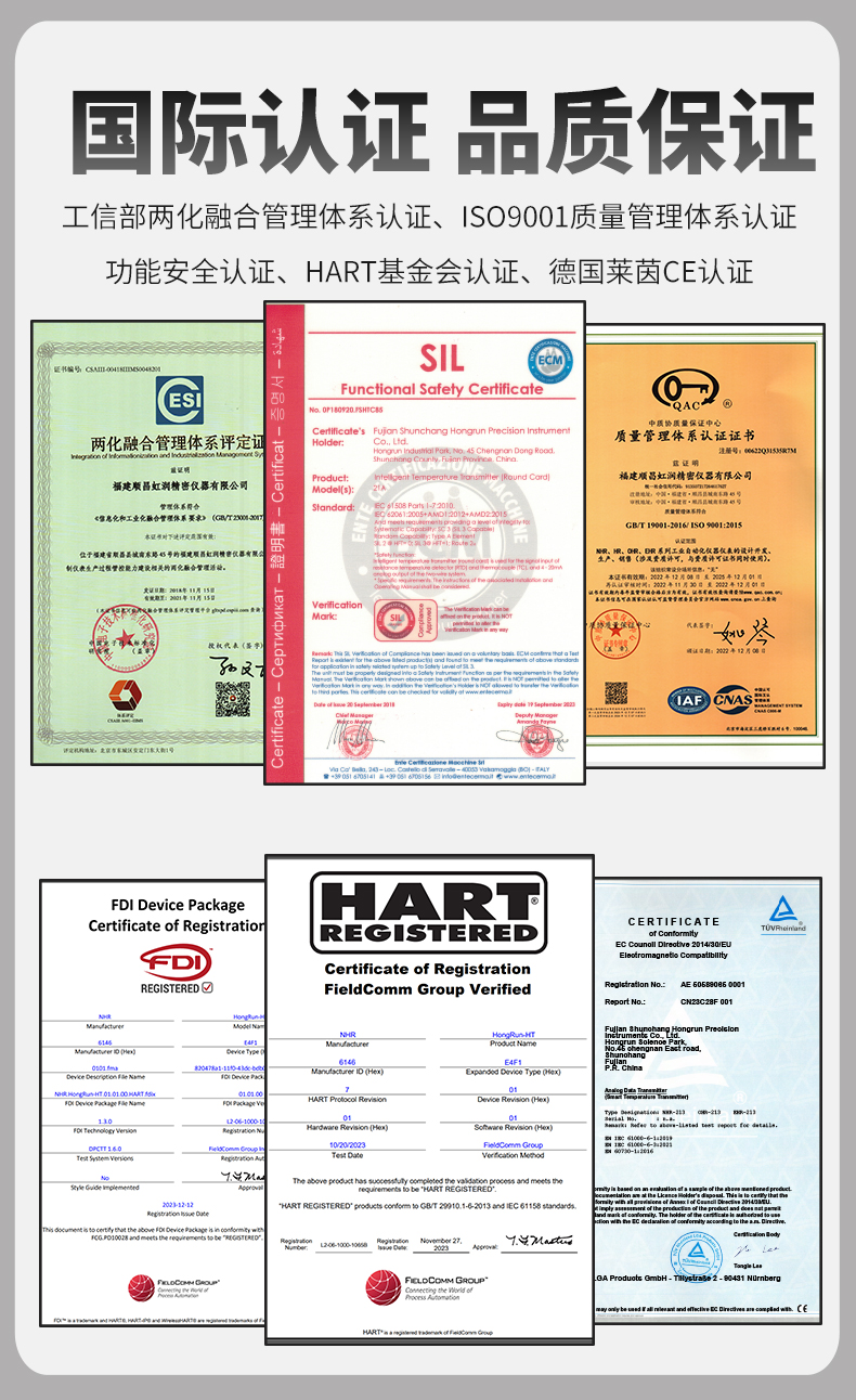 虹潤(rùn)公司是專業(yè)生產(chǎn)溫度變送器的國(guó)家專精特新“小巨人”企業(yè)。生產(chǎn)的智能溫度變送器,具有適配各類溫度傳感器,精度高,穩(wěn)定性好,通過(guò)編程線修改輸入信號(hào)類型及量程,高抗干擾等特點(diǎn)。該產(chǎn)品不僅通過(guò)HART基金會(huì)認(rèn)證、德國(guó)萊茵 CE 認(rèn)證與 SIL 功能安全認(rèn)證,還獲得具備減震抗干擾能力的溫度變送器、信號(hào)隔離器、一種二端子模塊、無(wú)源信號(hào)隔離器等4項(xiàng)國(guó)家發(fā)明專利,主持起草物聯(lián)網(wǎng)智能溫度儀表、現(xiàn)場(chǎng)設(shè)備工具(FDT)接口規(guī)范、工業(yè)過(guò)程測(cè)量和控制系統(tǒng)用溫度變送器等3項(xiàng)國(guó)家標(biāo)準(zhǔn),以及通信系統(tǒng)多通道數(shù)據(jù)采集控制終端規(guī)范軍用標(biāo)準(zhǔn),參與國(guó)際5G標(biāo)準(zhǔn)制定,取得智能溫度變送器、HART溫度變送器等3項(xiàng)相關(guān)軟件著作權(quán)。產(chǎn)品廣泛應(yīng)用于石油、化工、電力、冶金、制藥、食品、水處理等各種工業(yè)領(lǐng)域。
