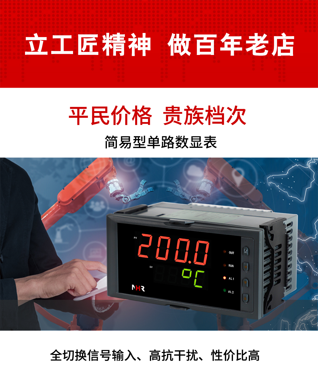 虹潤(rùn)公司是專(zhuān)業(yè)生產(chǎn)數(shù)顯表的國(guó)家專(zhuān)精特新“小巨人”企業(yè),生產(chǎn)的簡(jiǎn)易型數(shù)字顯示控制儀,具有全切換信號(hào)輸入,多種外形尺寸,高抗干擾,輸入/輸出/電源三隔離,性?xún)r(jià)比高等特點(diǎn)。該產(chǎn)品不僅通過(guò)德國(guó)萊茵 CE 認(rèn)證,還獲得巡回檢測(cè)顯示方法及裝置、儀表殼體等2項(xiàng)國(guó)家發(fā)明專(zhuān)利,主持起草工業(yè)過(guò)程控制系統(tǒng)用模擬輸入兩位或多位輸出儀表、物聯(lián)網(wǎng)智能溫度儀表通用技術(shù)條件等2項(xiàng)國(guó)家標(biāo)準(zhǔn),以及通信系統(tǒng)多通道數(shù)據(jù)采集控制終端規(guī)范軍用標(biāo)準(zhǔn),參與國(guó)際5G標(biāo)準(zhǔn)制定,取得簡(jiǎn)易數(shù)顯儀表等3項(xiàng)相關(guān)軟件著作權(quán)。產(chǎn)品廣泛應(yīng)用于電力、石化、冶金、化工、造紙、食品、輕工、制藥、熱處理、水處理、機(jī)械配套等各種工業(yè)現(xiàn)場(chǎng)。