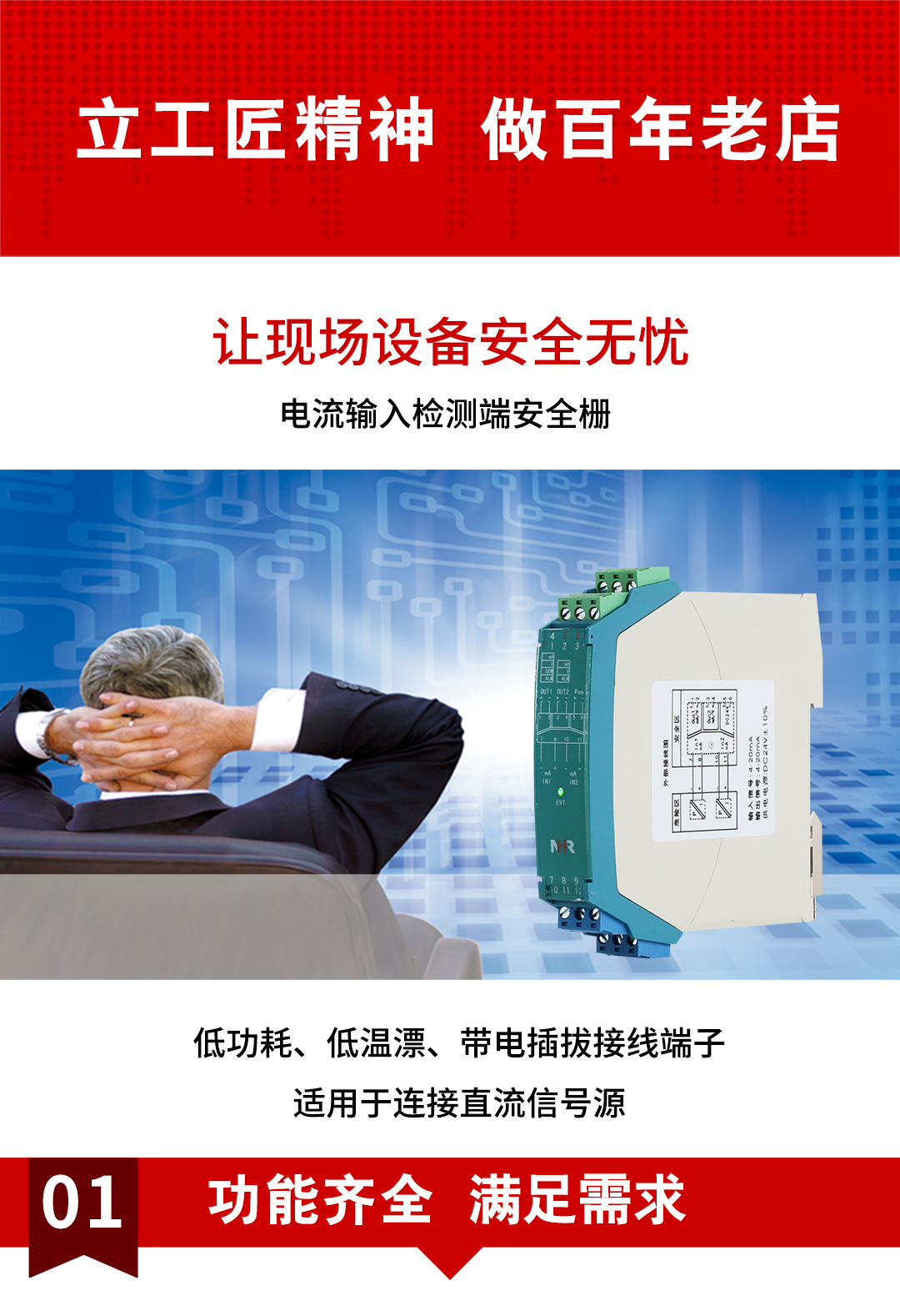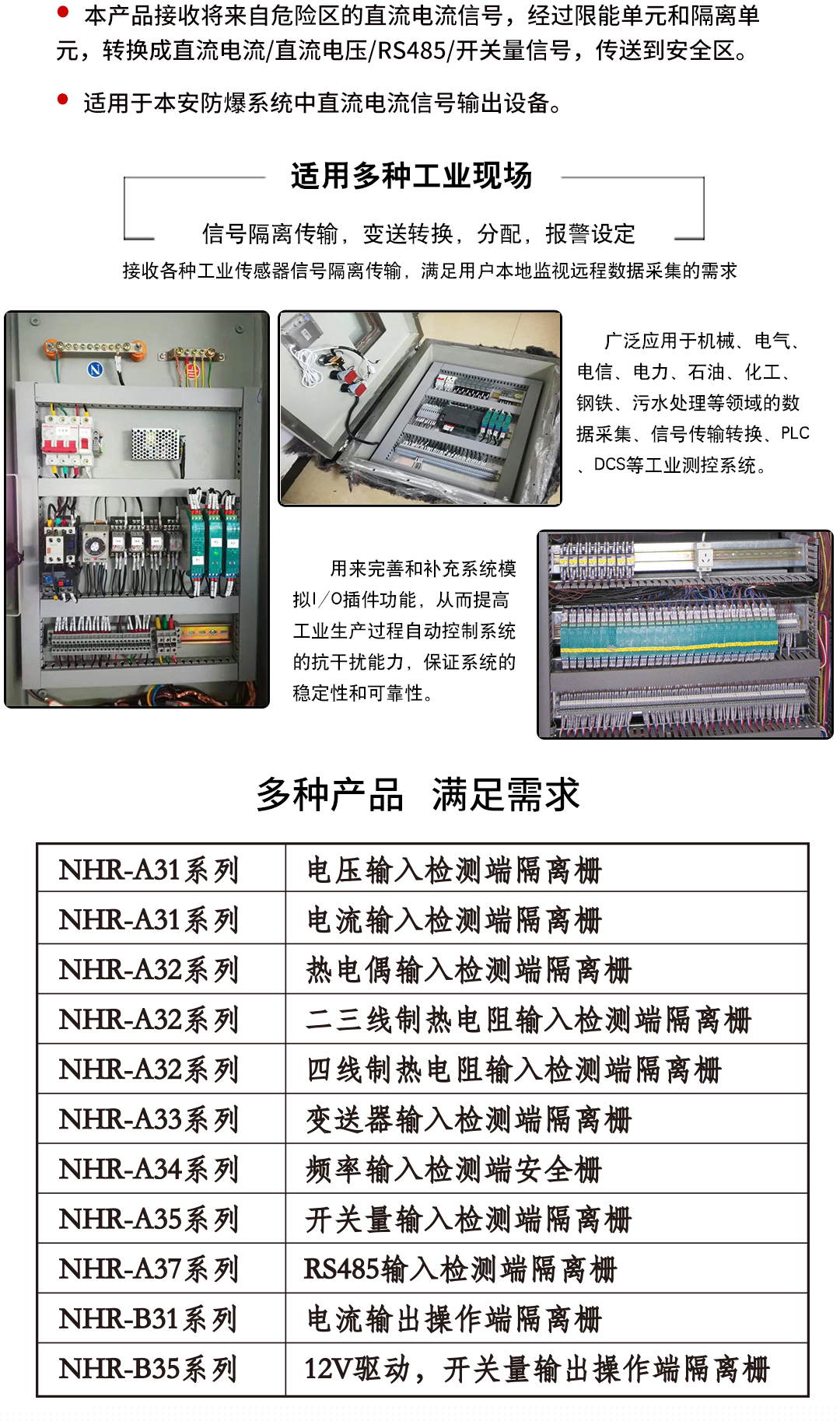 虹潤公司是專業(yè)生產(chǎn)隔離器的國家專精特新“小巨人”企業(yè)。生產(chǎn)的隔離式安全柵涵蓋信號電流輸入、電壓輸入、熱電阻輸入、熱電偶輸入、頻率輸入、開關量輸入等多種產(chǎn)品類型。產(chǎn)品獲得具備減震抗干擾能力的溫度變送器、信號隔離器、一種二端子模塊、無源信號隔離器等4項國家發(fā)明專利,主持起草物聯(lián)網(wǎng)智能溫度儀表、現(xiàn)場設備工具(FDT)接口規(guī)范、工業(yè)過程測量和控制系統(tǒng)用溫度變送器等3項國家標準,以及通信系統(tǒng)多通道數(shù)據(jù)采集控制終端規(guī)范軍用標準。參與國際5G標準制定,取得智能隔離式安全柵等4項相關軟件著作權。產(chǎn)品廣泛應用于石油、電力、化工,冶金、智能制造、污水處理等諸多行業(yè)。