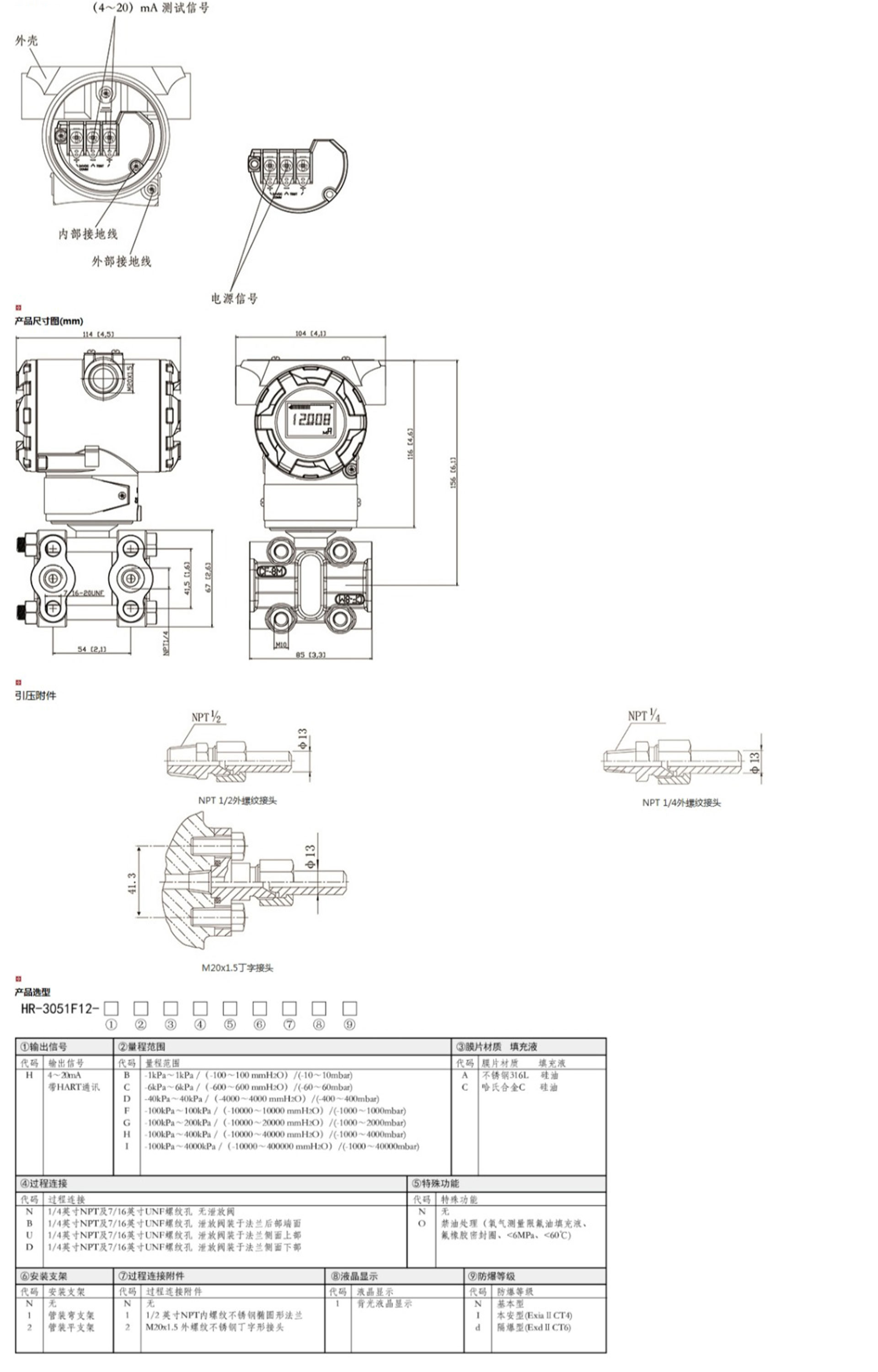 HR-3051F12智能單晶硅夾板式壓力變送器能準(zhǔn)確的測量壓力,并把它轉(zhuǎn)換成4~20mADC的輸出信號。該變送器可通過三按鍵本地操作,或通用手操器、組態(tài)軟件、以及手機APP遠程操作,在不影響4~20mA DC的輸出信號的同時,進行顯示與組態(tài)。