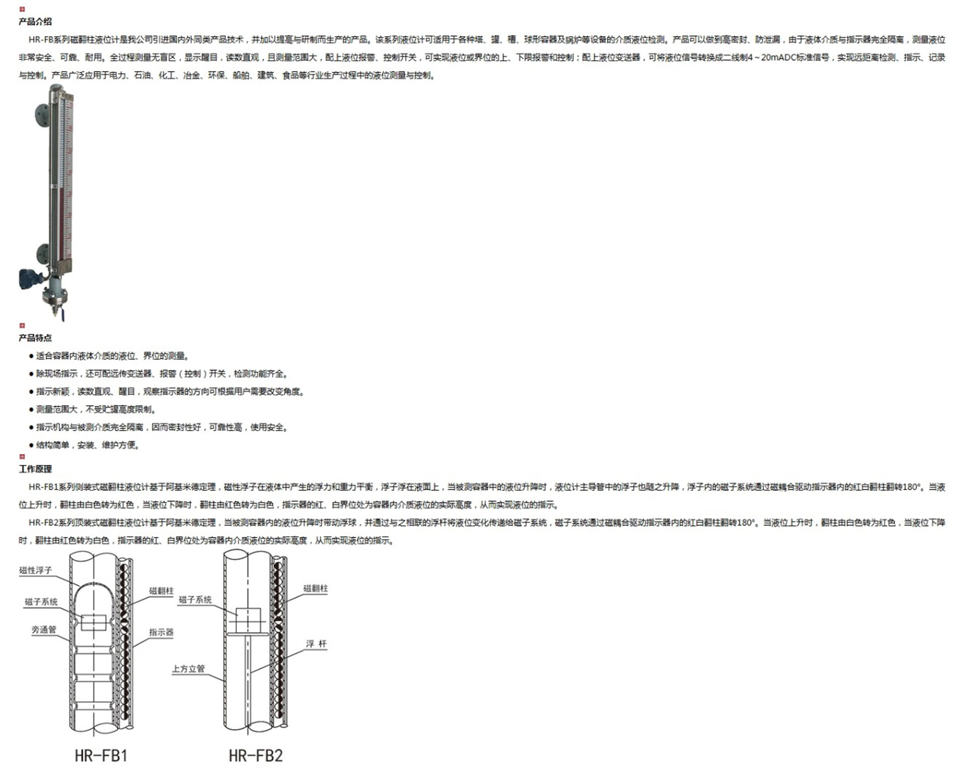 HR-FB系列磁翻柱液位計是我公司引進國內外同類產品技術,并加以提高與研制而生產的產品。該系列液位計可適用于各種塔、罐、槽、球形容器及鍋爐等設備的介質液位檢測。產品可以做到高密封、防泄漏,由于液體介質與指示器完全隔離,測量液位非常安全、可靠、耐用。